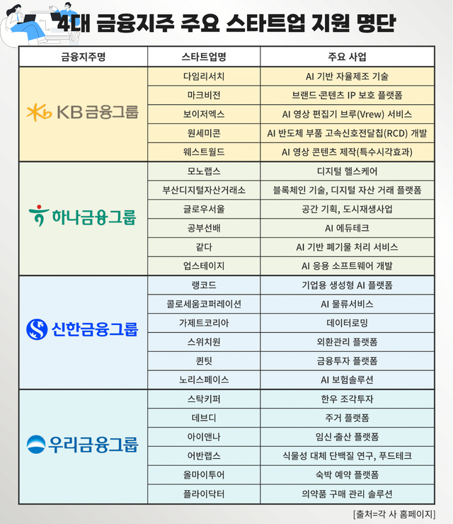 4대 금융그룹(국민·하나·신한·우리)이 이재명정부의 '생산적 금융' 기조에 맞춰 스타트업 성장 지원에 팔을 걷어붙였다. 정책금융기관 및 지방자치단체 등과 협력해 유망 스타트업을 선별한 후 자금 지원과 맞춤형 육성 프로그램을 제공하는 식으로 민간 중심의 혁신 생태계 조성을 돕겠다는 복안이다. 금융권 안팎에선 4대 금융그룹이 의욕을 갖고 뛰어든 만큼 수혜 기업들의 성장 가능성은 한층 높아질 것이라는 반응이 우세하다. 이미 투자시장에서는 수혜 기업을 예의주시하는 움직임도 생겨난 상태다.