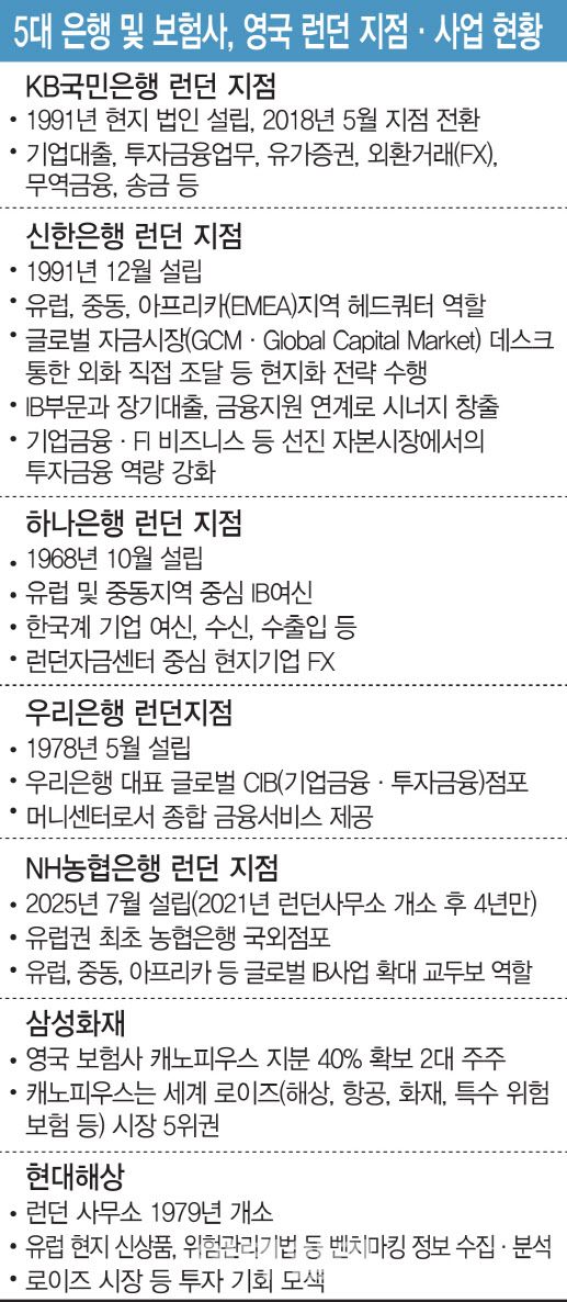 금융권 관계자는 “런던은 미국 뉴욕과 함께 세계 최대 금융시장이고 EMEA지역을 연결하는 금융허브라는 점에서 글로벌 사업을 위해 전략적 요충지”라며 “외환시장 선진화 방안 등과 맞물려 국내 은행·보험사 등의 진출이 지속적으로 확대할 것”이라고 말했다.