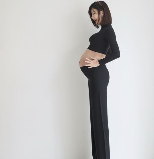 공개된 사진은 성현주의 만삭 사진이다. 그는 올블랙 상하의를 입고 배를 감싸 안은 채 미소를 짓고 있다.
