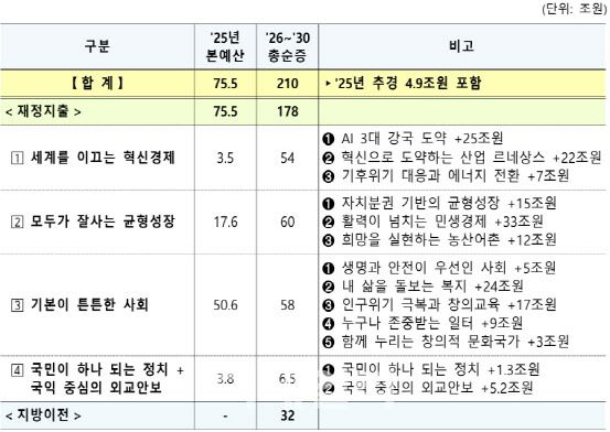 20일 국정위가 발표한 ‘이재명 정부 국정운영 5개년 계획(안)’에 따르면 정부는 핵심공약 및 주요 국정과제의 이행을 뒷받침하기 위해 쓸 총 210조원 중 5대 분야 주요 재정사업에 178조원을 투자한다. 5대 분야는 △국민이 하나 되는 정치(1조 3000억원) △세계를 이끄는 혁신경제(54조원) △모두가 잘사는 균형성장(60조원) △기본이 튼튼한 사회(58조원) △국익 중심의 외교안보(5조 2000억원) 등이다.