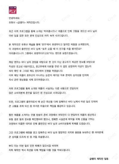 끝으로 “그간 프로그램에 애정을 갖고 임해준 바다와 지지와 응원을 보내준 팬 여러분께 큰 상처를 드린 점 거듭 죄송하다”며 “더는 이번 일로 인한 피해가 없길 바라며 제작진 역시 최선을 다해 책임지겠다”고 약속했다.