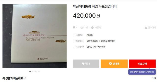 지난해 12월 탄핵된 윤석열 전 대통령 취임 기념우표 역시 중고시장에서 높은 가격을 형성하고 있다. 당시 소형시트는 430원, 우표첩은 2만7000원에 발행됐다. 현재 중고거래 사이트에서 소형시트가 약 1만6000원, 우표첩은 25만원에 거래되고 있다.