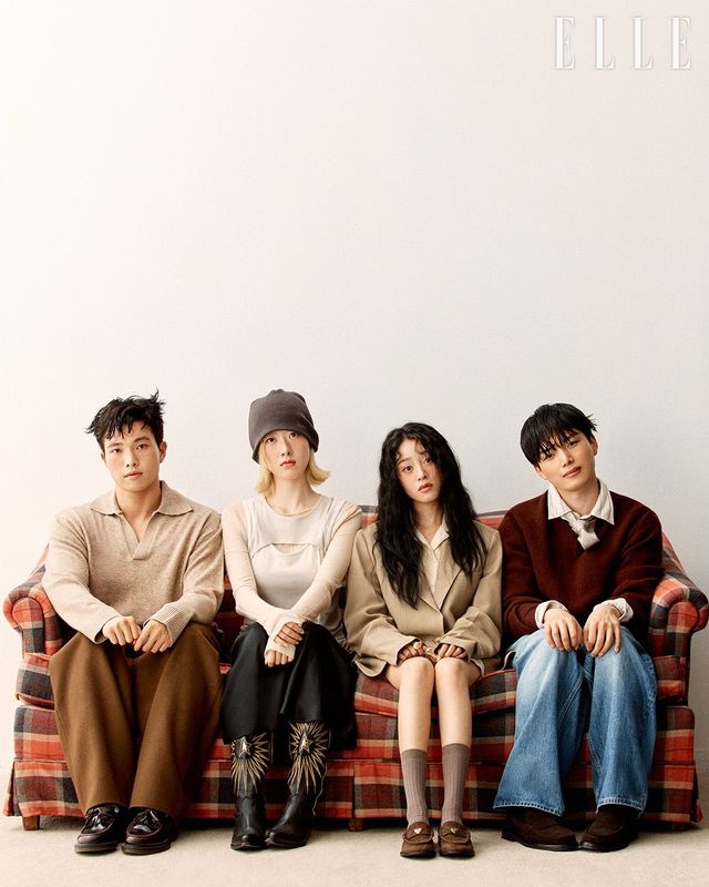 승리가 입은 니트 톱은 H&M, 팬츠는 Cos, 슈즈는 Dr.Martens. 지수가 겹쳐 입은 톱은 모두 Margesherwood, 스커트는 &Other Stories, 부츠는 Golden Goose, 니트 모자는 Coyseio, 링은 Rushuo. 민홍이 입은 셔츠, 스커트, 재킷은 모두 Golden Goose, 목걸이는 &Other Stories, 반지는 H&M, 양말은 Arket, 슈즈는 Margesherwood. 재윤이 입은 셔츠와 타이는 Uniqlo, 브이넥 니트 톱은 Arket, 팬츠는 H&M. 슈즈는 Cos.