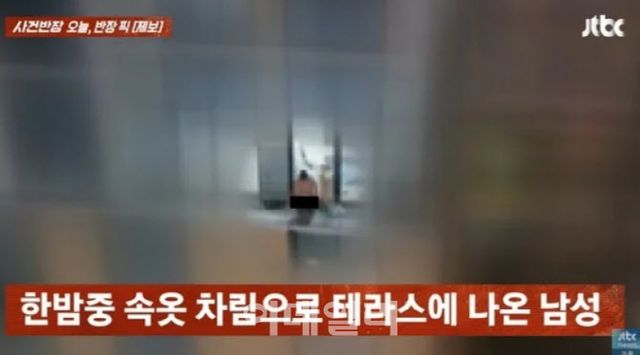 지난 19일 JTBC ‘사건반장’은 제보자 A씨가 촬영한 영상을 공개했다. 영상은 지난 12일 오후 9시쯤 인천 소재 한 오피스텔 5층에서 촬영된 것으로, 남성은 속옷 차림으로 테라스에 나와 있다가 갑자기 속옷을 내리고 거리 아래로 소변을 본 뒤 다시 집 안으로 들어간 모습이 담겼다.