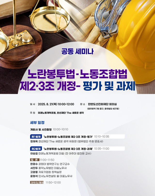 세미나 제1발제는 정재욱 위원장(한선재단 The 새로운 생각/ 법무법인 주원 변호사)이 '노란봉투법·노동조합법 제2·3조 개정 평가'를 주제로 한다.