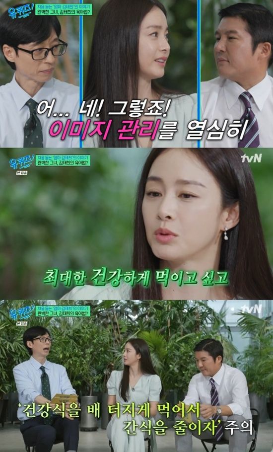 이를 들은 유재석은 "이런 게 어머니들이 불만이시더라"고 하자 김태희는 "맞다. 최대한 건강하게 먹이고 싶다. '건강식을 배 터지게 먹어서 간식을 줄이자'는 주의다. 저도 아침에 샐러드 한가득 먹고, 몸에 좋은 것 먹으려고 노력하고 가족들도 그렇게 챙겨주려고 하는 편"이라고 설명했다.