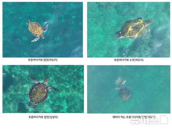 뉴시스 보도에 따르면, 21일 다큐제주 오승목 감독 및 제주대학교 고래·해양생물보전연구센터에 따르면 지난 20일 제주시 구좌읍 김녕리 앞바다에서 푸른바다거북이 암컷 두 마리가 관찰됐다.