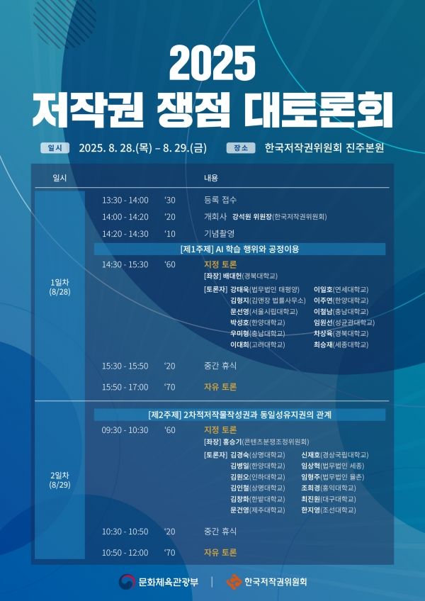 문화체육관광부(장관 최휘영, 이하 문체부)와 한국저작권위원회(위원장 강석원, 이하 위원회)는 오는 8월 28일부터 29일까지 양일간, 위원회 진주 본원에서 「2025 저작권 쟁점 대토론회」를 개최한다.