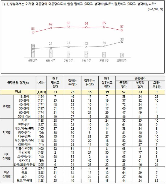 이번 조사에 따르면 이 대통령의 국정 운영에 대해 ‘잘하고 있다’(매우 잘함 + 잘함)는 응답률은 57%로 집계됐다. 8월 1주차와 비교해 8%p(포인트) 감소한 수치다. 반면 부정평가는 33%로, 같은 기간과 견줘 9%포인트 상승했다.