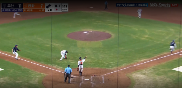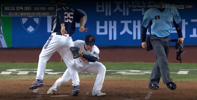 한화 포수 최재훈의 송구를 받은 김종수가 태그를 시도했다. 그러자 양의지는 선 채로 달려와 홈을 밟았다. 슬라이딩할 거라 예상했던 김종수의 글러브는 양의지를 건드리지 못하고 허공만 갈랐다. 원심은 아웃이었으나, 비디오판독 끝에 세이프로 정정됐다.