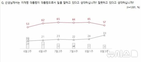 뉴시스 보도에 따르면, 엠브레인퍼블릭·케이스탯리서치·코리아리서치·한국리서치가 지난 18∼20일 만 18세 이상 남녀 10001명을 대상으로 진행한 전국지표조사(NBS)에서 이 대통령의 국정 운영에 대해 '잘하고 있다'는 답변은 57%로 집계됐다. '잘못하고 있다'는 답변은 33%였다.