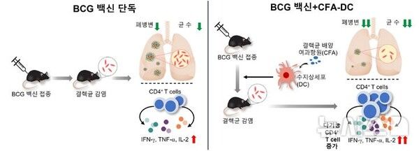 먼저 BCG 백신을 맞힌 마우스에 결핵균에서 뽑아낸 항원 성분으로 활성화시킨 수지상세포를 주입했다. 결핵균 감염 1주일도 안돼 마우스 폐 조직에 결핵균 감염을 인식하는 T세포가 빠르게 증가했다. 감염 10주 후, BCG 단독 투여 그룹 대비 결핵균 성장이 90% 이상 억제됐다.