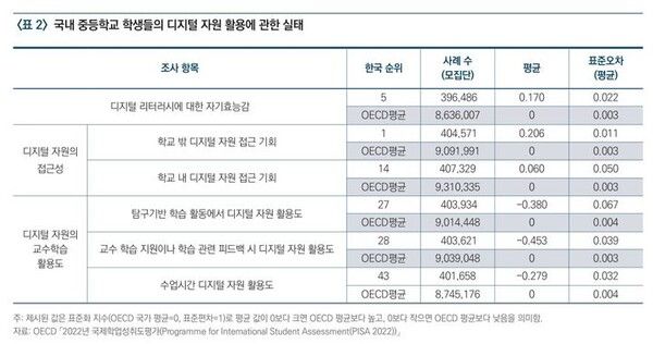 KEDI가 분석한 OECD 국제학업성취도평가(PISA 2022) 결과에 따르면 한국의 '수업 중 디지털 자원 활용도' 점수는 -0.279로, 조사 대상 43개국 중 43위를 기록했다.