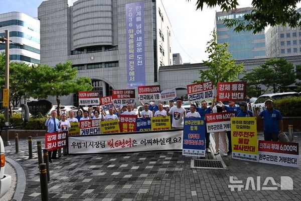 참가자들은 '완주의 희생만 강요하는 완주·전주 통합 결사반대' '우범기 시장님 빚 6000억원은 어찌하실래요?' 등의 구호가 적힌 피켓과 현수막을 들고 출근길 시민들에게 통합 반대의 정당성을 알렸다.