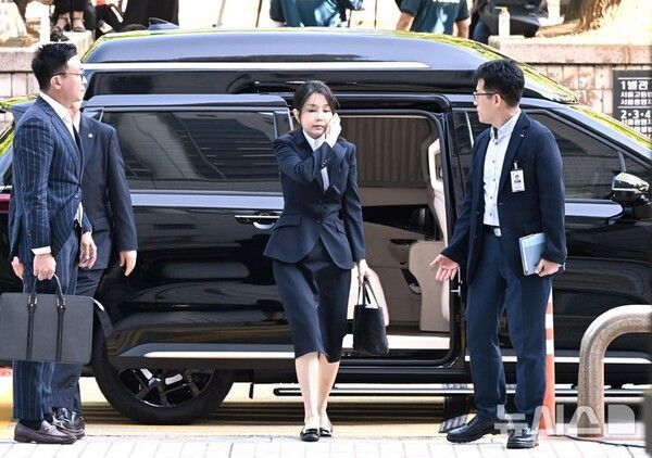 김 여사가 탄 호송차는 이날 오후 1시17분 특검 사무실이 있는 건물 앞에 모습을 드러냈다. 그는 서울남부구치소에서 대면 진료를 받고 조사를 받으러 나왔다.