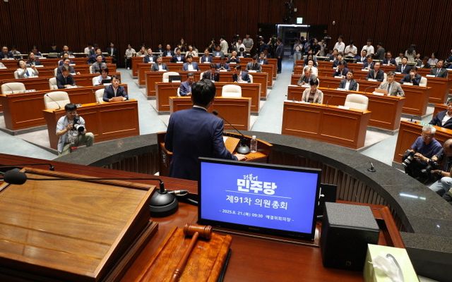 정청래 더불어민주당 대표가 21일 서울 여의도 국회에서 쟁점법안 처리를 위한 8월 임시국회 본회의 개회를 앞두고 가진 의원총회에서 발언하고 있다. ⓒ 연합뉴스