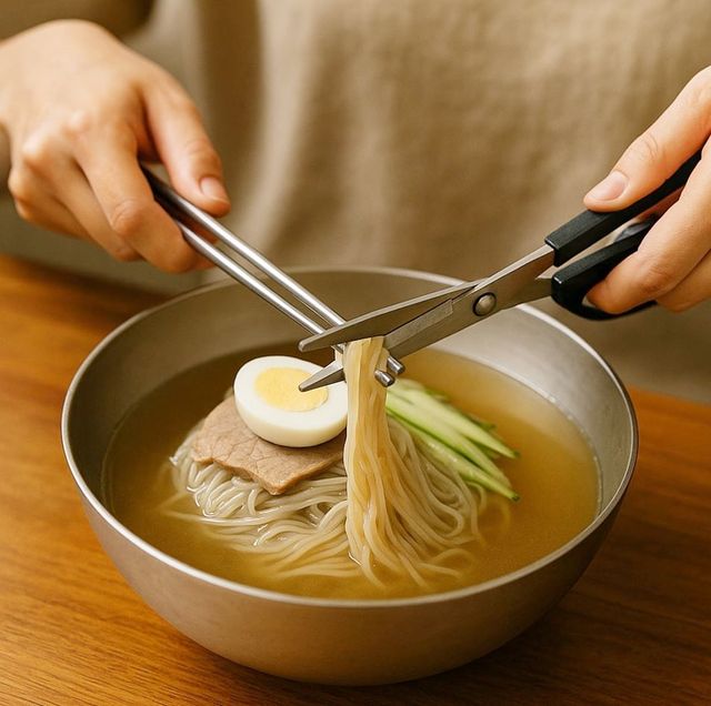 여름철 별미 평양냉면을 가위로 자르는 모습. 기사 이해를 돕기 위해 AI를 활용해 제작한 이미지입니다. 실제 모습과 다소 차이가 있을 수 있습니다.