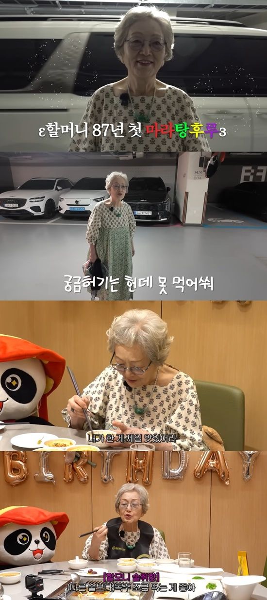 20일 김영옥의 유튜브 채널 '김영옥'에는 '87세에도 고량주 마시는 김영옥 할머니의 인생 첫 하이디라오 (훠궈·탕후루·네일 체험) EP.2'라는 제목의 영상이 게재됐다.