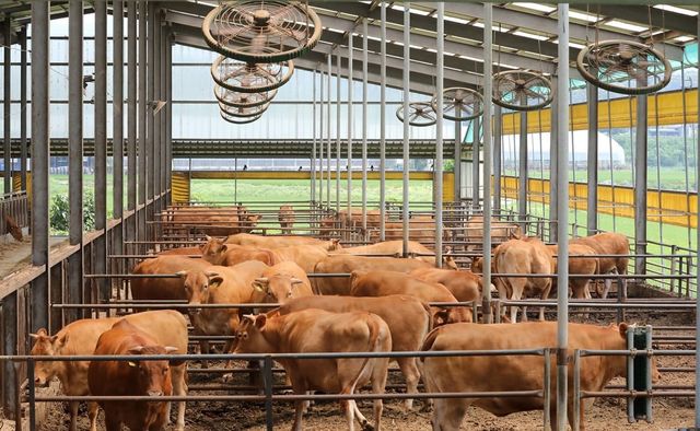 한 축사에서 소들이 대형 선풍기 바람을 쐬며 여름을 이겨내고 있다. / 뉴스1