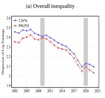 그는 “소득 상·하위 10%를 백분위수 비율로 살펴본 10분위수 배율(P90/P10)로 소득 불평등도를 분석한 결과 2002년부터 2022년까지 소득 불평등은 꾸준히 감소했다”면서 “주된 요인은 하위 10% 계층의 임금 상승폭이 상대적으로 컸기 때문”이라고 설명했다. 이러한 하위 계층의 임금 상승폭은 최저임금의 인상 때문이라고 강조했다.