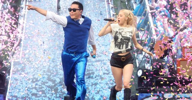 '2025 싸이 흠뻑쇼'에서 열연 중인 가수 싸이와 블랙핑크 로제(오른쪽). / 뉴스1