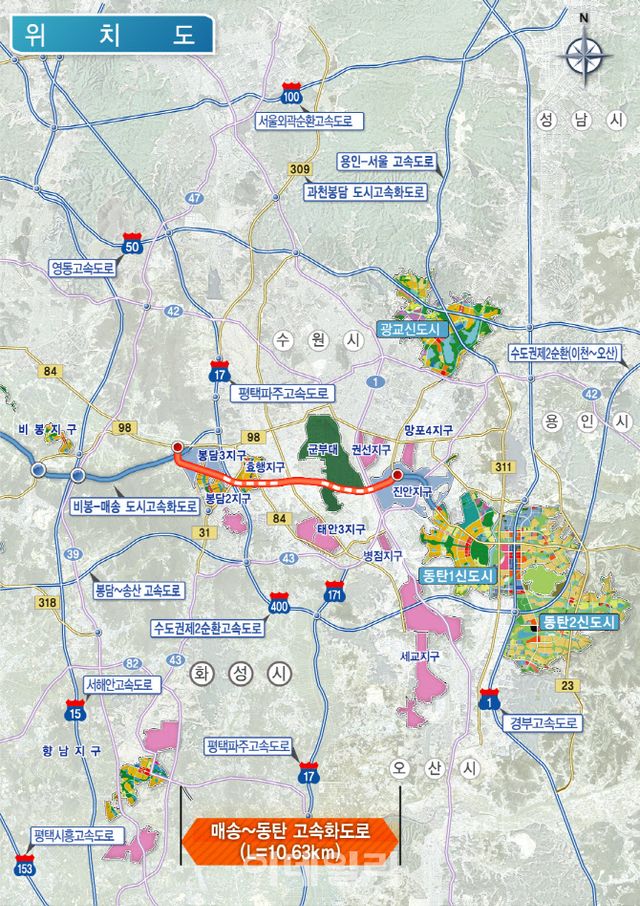 21일 경기 화성시에 따르면 이 도로는 화성시 매송면 원평리(비봉매송간 도로, 샘내IC)에서 반정동(동탄원천로)을 연결하는 길이 약 10.63km의 왕복 4차로 고속화도로다. 총사업비는 6891억원이며, 손익공유형(BTO-a) 방식(60개월 공사, 50년간 운영)으로 제안됐다.