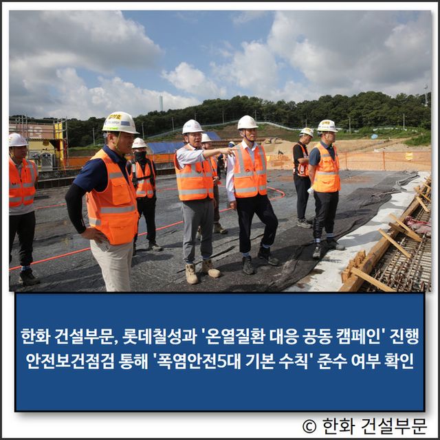 ㈜한화(000880) 건설부문(이하 한화)이 지난 20일 대전하수처리장 현대화공사현장에서 롯데칠성음료와 함께 여름철 막바지 폭염 속 근로자 건강을 지키기 위한 '온열질환 대응 공동 캠페인'을 진행했다.