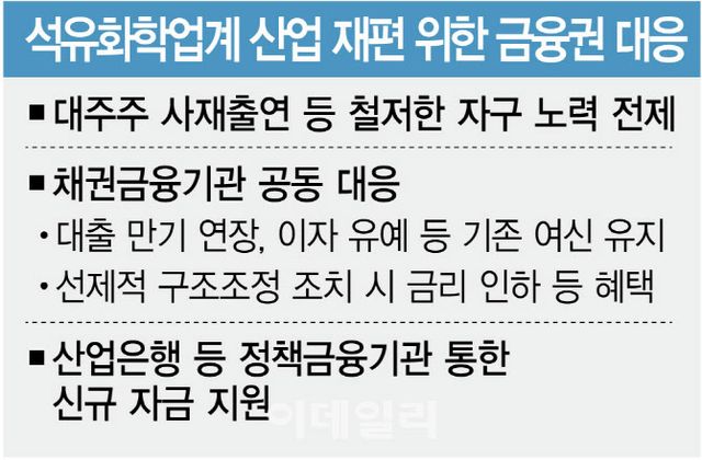 21일 금융권에 따르면 5대 시중은행(KB국민·신한·하나·우리·NH농협)은 이날 금융위원회 주재 ‘석유화학 경쟁력 제고를 위한 금융권 간담회’에서 석유화학기업 기존 대출을 유지하라는 지침을 받았다. 올 상반기 말 5대 은행의 석화업종 대출잔액은 약 16조원으로 각 은행이 3~4조원의 대출을 하고 있다. 대기업 대출 중에서 석화업종이 차지하는 비율은 10~12% 수준으로 은행 자산 포트폴리오에서 차지하는 비중이 만만찮다.