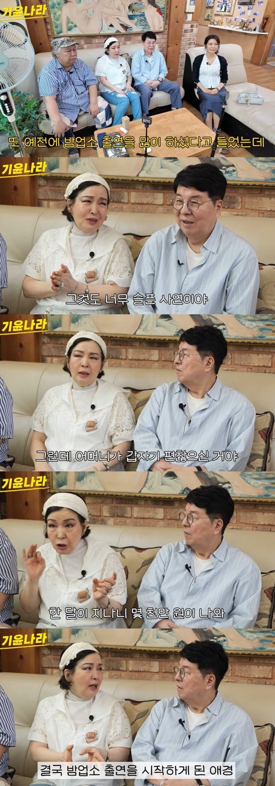 이어 그는 "내가 '아니에요. 저는 아직까지는 생각이 없다'라고 이야기하고 쭉 거절했었다. 그런데 어머니가 갑자기 편찮으셨다. 병원비가 나왔는데 어마어마했다. 20일마다 몇백만 원씩 나오고 한 달이 지나니 몇천만 원이 나왔다. (그래서) 밤업소를 시작했다"라고 설명했다.