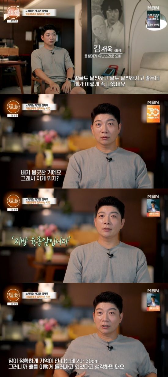 다 큰 여동생의 식단까지 유난스럽게 관리하는 이유에 대해 김재욱은 "얼굴도 날씬하고 팔도 날씬해지고 좋았는데 배가 이렇게 좀 나왔더라. 배가 봉긋하더라"며 "저게 뭐지 싶어 부랴부랴 알아봐서 큰 병원에 갔는데 지방육종암이라더라"고 회상했다.