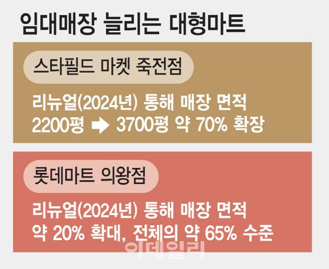 실제로 현재 전국 156개 이마트(139480)·이마트 트레이더스에 입점한 2600여개 임대매장 가운데 약 960곳(전체 약 40%)이 연매출 30억원 이하의 자영업자들로 분류되고 있다. 이마트는 2020년부터 수도권 지방 등 점포 리뉴얼을 통해 체험형 콘텐츠와 식음료(F&B) 테넌트를 꾸준히 확대 중이다. 대표적으로 지난해 재단장한 스타필드마켓 죽전점의 경우 임대 면적이 7260㎡(약 2200평)에서 1만 2210㎡(3700평)으로 약 70% 늘었다. 최근에도 경기도 일산의 ‘이마트 더타운몰 킨텍스’를 ‘스타필드마켓’으로 리뉴얼했다.