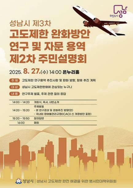 [와이뉴스] 성남시는 오는 27일 오후 2시 시청 온누리에서 ‘제3차 고도제한 완화방안 연구 및 자문 용역’과 관련한 제2차 주민설명회를 연다.