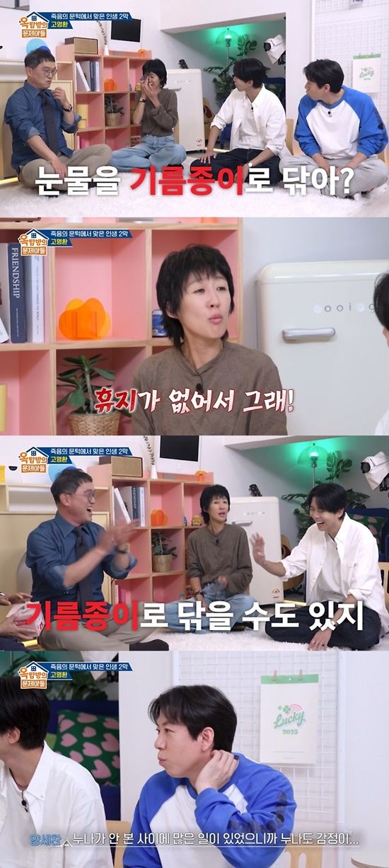 주우재와 양세찬 등 MC들은 분위기를 환기시키려 "눈물을 기름종이로 닦냐"고 넉살을 부렸고, 홍진경은 "휴지가 없어서 그런다. 기름종이로 닦을 수도 있지"라고 토로했다.