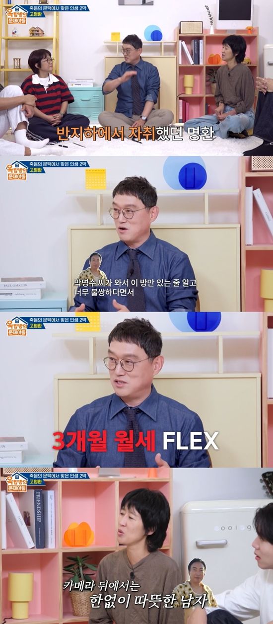 고명환은 "제가 딱 300만 원 가지고 올라왔다. 어떤 빌라 반지하에 살았다. 박명수 씨가 와서 이 방만 있는 줄 알고 진짜 너무 불쌍하다면서 3개월 치 월세를 주고 갔다"라며 박명수에게 감사를 전했다.