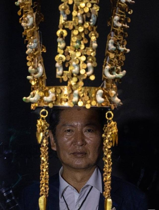 정청래 더불어민주당 대표가 20일 경주박물관에서 국보 제188호인 천마총 금관을 보고 있는 모습. / SNS 갈무리