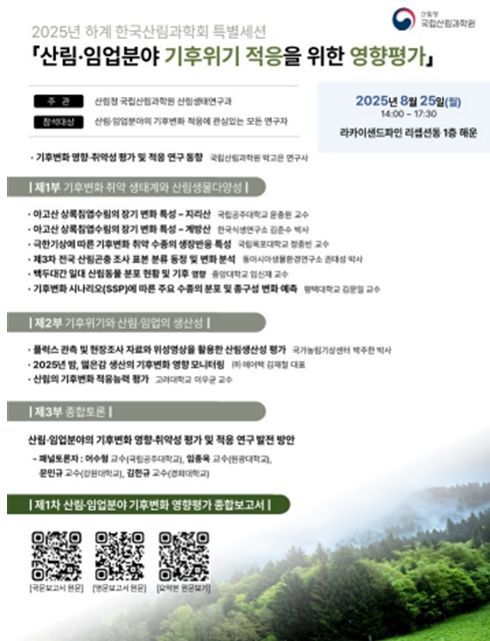 이번 특별세션에서는 2023년 발간된 『제1차 산림·임업분야 기후변화 영향평가 종합보고서』의 핵심 내용을 국민이 쉽게 이해할 수 있도록 재구성한 '한눈에 보는 우리 산림의 기후변화 영향' 자료도 함께 공개된다.