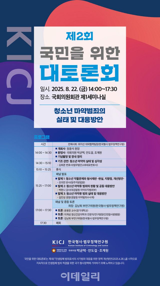 정웅석 한국형사·법무정책연구원장은 “이번 대토론회는 청소년 마약범죄의 심각성을 알리고, 이론적이기만 한 논의가 아닌 실효성 있는 대응책을 논하고자 마련됐다”며 “연구원은 앞으로도 민생범죄 척결을 위해 국민의 목소리를 정책에 담아낼 수 있는 공론의 장을 지속 확대해 나가겠다”고 말했다.