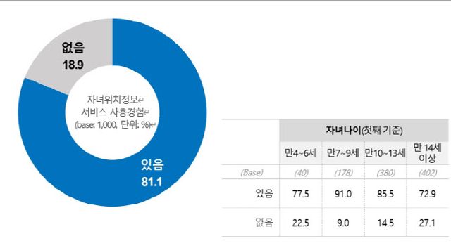 자녀 위치정보 서비스 사용경험에 대해 81.1%가 사용한 경험이 있다고 응답했고, 첫째 나이 기준 만 7~9세 자녀 사용 경험률이 91.0%로 가장 높게 나타났다. 자녀 위치 확인 서비스를 처음 이용한 연령은 만7~8세(43.8%)로 대체로 초등학교 저학년 시기부터 해당 서비스를 도입한 것으로 나타났으며 사용경험 서비스로 ‘구글패밀리링크(22.8%)’, ‘아이쉐어링(13.6%)’이 주로 나타났다.