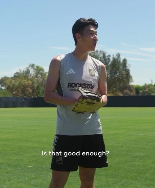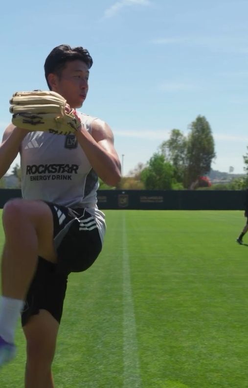영상에서 손흥민은 축구화를 신은 채 미국인 수비수 라이언 홀링스헤드에게 포수를 맡기고 공을 던졌다. 왼손에 글러브를 낀 그는 가볍게 와인드업까지 했다.