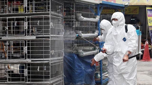 광주광역시 북구청 시장산업과 동물정책팀 관계자들이 지역 내 한 전통시장 닭·오리 판매업소에서 고병원성 조류인플루엔자(AI) 예방을 위해 소독 작업을 벌이고 있다. / 연합뉴스