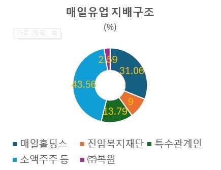 매일유업의 최대주주는 매일홀딩스로, 31.0%의 지분을 갖고 있다. 나머지는 특수관계인(13.79%), 진암복지재단(9%), ㈜복원(2.59%), 소액주주 등(43.56%) 등이다.