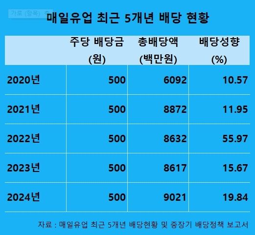 매일유업의 지난해 배당금은 주당 500원으로, 5년째 제자리걸음을 하고 있다. 배당성향도 2020년 10.57%에서 지난해 19.84%로 높아지기는 했지만, 목표인 20%에는 아직 미치지 못하고 있다.