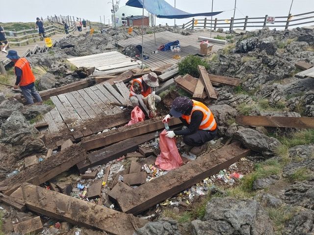 [한라일보] 제주 한라산국립공원 정상 백록담 주변에 등반객 쉼터 용도로 설치된 나무데크를 19년 만에 전면 교체하는 과정에서 무단 투기된 쓰레기가 무더기로 발견됐다.