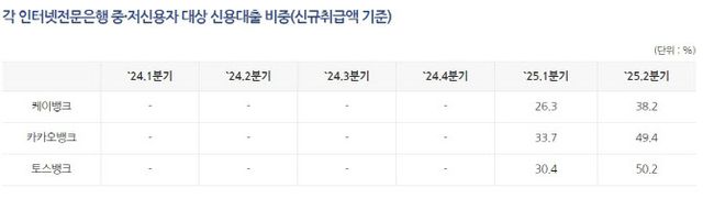평균잔액 기준으로도 인뱅 3사는 금융당국 규제 비율을 웃돌았다. 카카오뱅크 33.1%, 토스뱅크 35%, 케이뱅크 34.4%로 집계됐다. 전분기 대비로는 각각 0.3%포인트, 0.7%포인트, 0.6%포인트 상승했다.