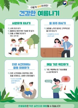 온열질환 예방을 위한 건강수칙으로는 △물 자주 마시기(갈증을 느끼지 않아도 규칙적으로), △시원하게 지내기(샤워 자주 하기, 헐렁하고 밝은색 옷 입기, 외출 시 햇볕 차단하기), △더운 시간대에는 활동 자제하기, △매일 기온 확인하기 등이 있다.