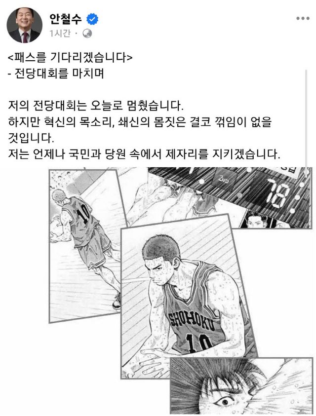 안 의원은은 자신의 페이스북에 ‘패스를 기다리겠습니다’라는 제목의 글과 함께 만화 ‘슬램덩크’ 속 주인공 이미지를 올리며 이같이 밝혔다. 향후 재기의 기회를 노리겠다는 의미로 풀이된다.