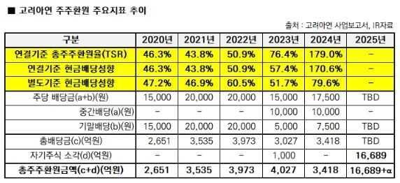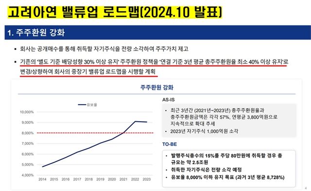 고려아연은 지난해 10월 '기업가치 제고 계획(밸류업 로드맵)'에서 지속적인 자사주 소각 등을 통해 3년 평균 총주주환원율을 최소 40% 이상 유지하겠다고 밝힌 바 있다.