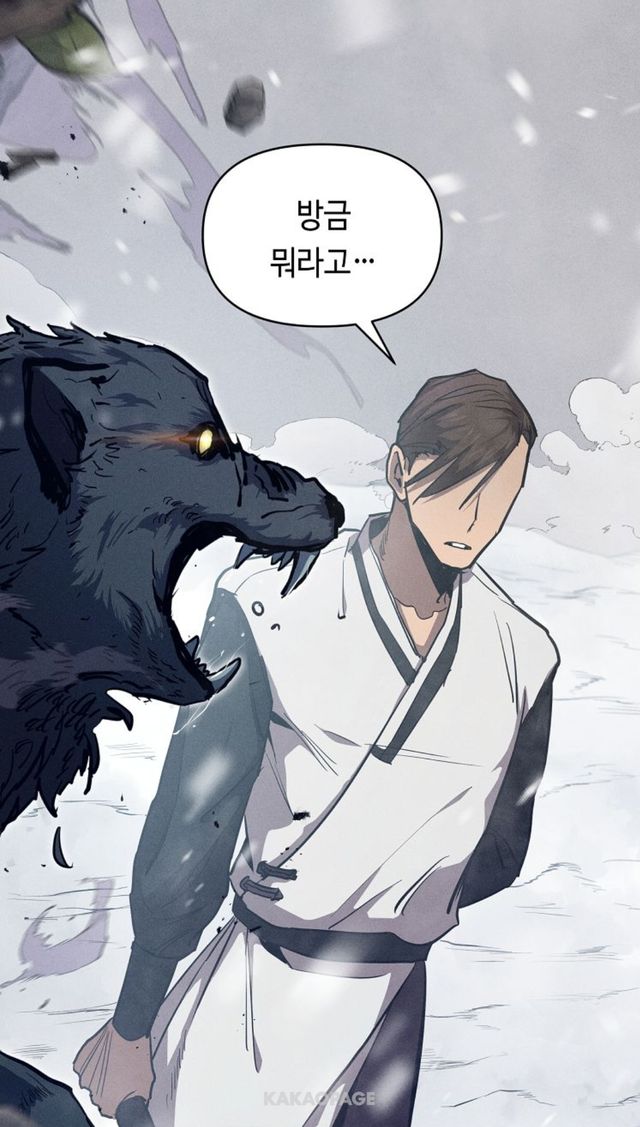 숲 속에서 튀어나온 거대한 늑대가 그들을 덮칩니다.