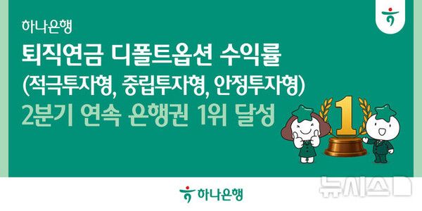 뉴시스 보도에 따르면, 금융감독원 통합연금포털 공시에 따르면 하나은행은 2분기 퇴직연금 디폴트옵션 '적극투자형포트폴리오2', '중립투자형포트폴리오3', '안정투자형포트폴리오2'에서 각각 10.67%, 7.60%, 6.35%의 연간 수익률을 기록했다. 이는 은행권에서 가장 높은 수익률이다.