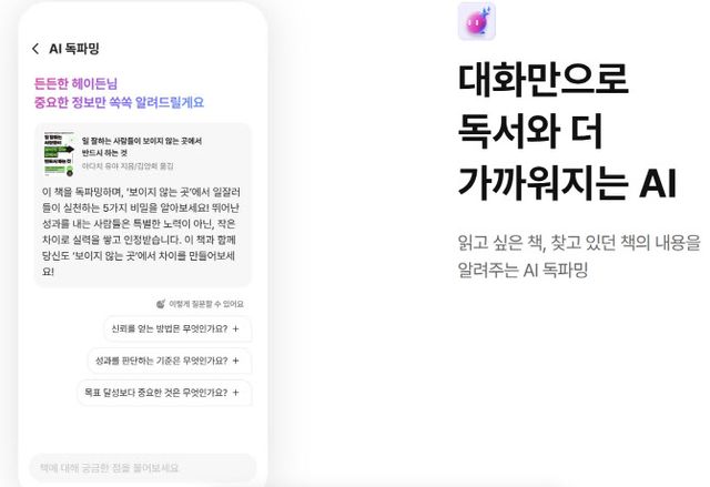 인공지능 스타트업 마인드로직과 함께 선보인 이 서비스는 챗봇에게 가상의 인격을 부여하고 지식을 학습시켜 직접 채팅을 할 수 있는 서비스다. 임의의 작가나 등장인물의 화법, 사고방식을 구현한 AI 챗메이트가 독자와 대화하듯 정보를 전달한다.